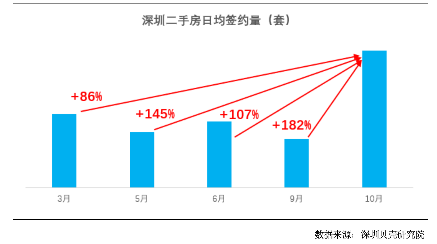 据深圳贝壳研究院监测,10月份(截至13日)日均签约量为今年最高,也是近四年最高。具体来说,10月份日均签约量环比9月增长182%,与今年成交较为火爆的3月、5月、6月对比,增幅也非常明显,分别为:86%、145%、107%。不难看出,“929新政”效果立竿见影。