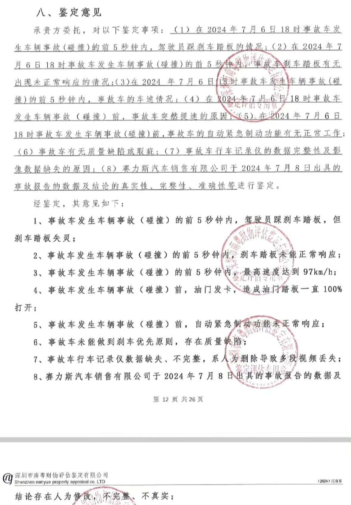 11月7日,赛力斯汽车就上述情况发表声明称,经对车辆数据分析,事故发生前车辆转向和制动功能正常;事故发生时车辆处于人驾状态,电门开度100%,无主动制动记录。车主不认可以上结论,自行委托深圳市南粤财物评估鉴定有限公司进行鉴定,相关内容在互联网引发讨论。目前案件已进入司法程序,事故鉴定机构需由双方共同选定或由法院指定,事实认定应以法院查明为准。