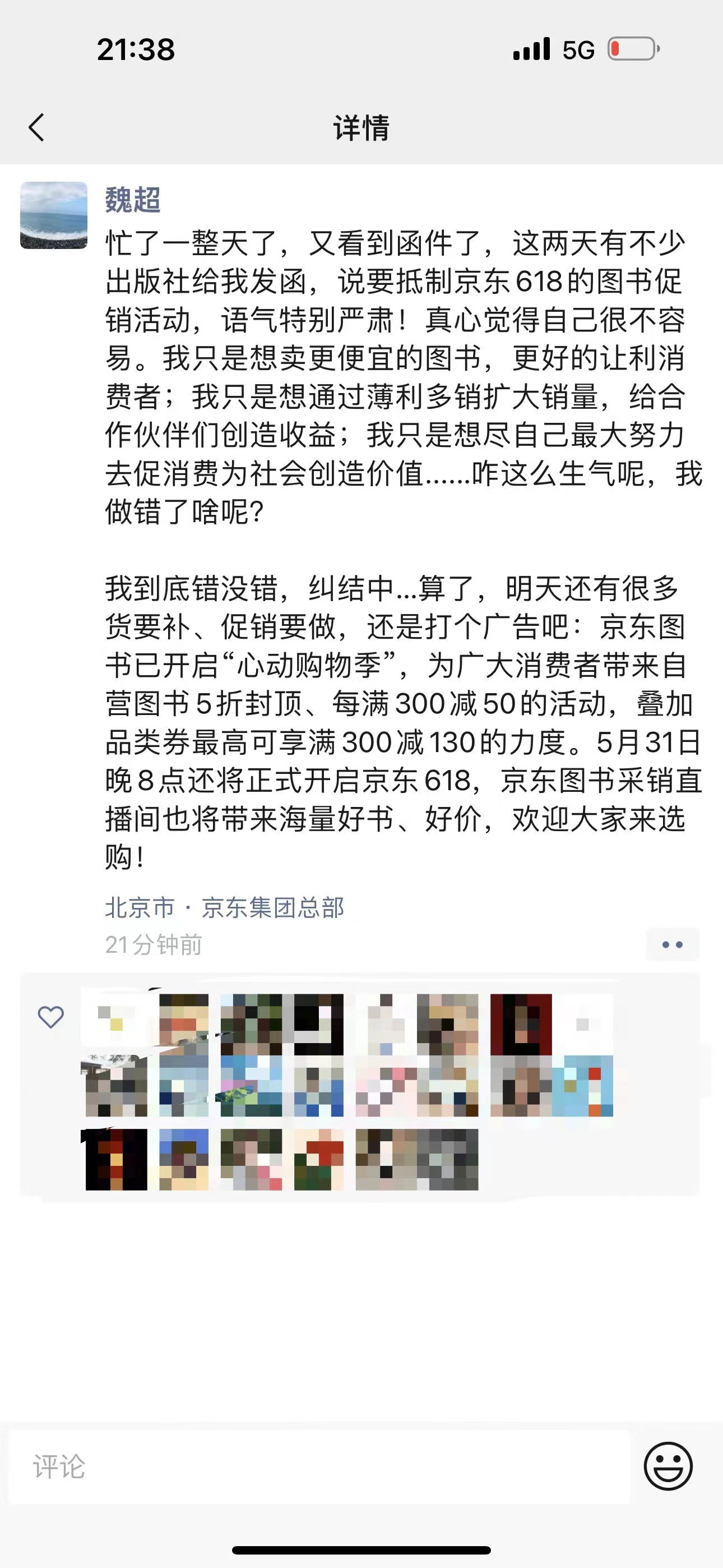 5月22日,澎湃新闻记者获悉,有京东图书采销在朋友圈公开回应此事。这位采销表示:“这两天有不少出版社给我发函,说要抵制京东618的图书促销活动,语气特别严肃!真心觉得自己很不容易。我只是想卖更便宜的图书,更好地让利消费者;我只是想通过薄利多销扩大销量,给合作伙伴们创造收益;我只是想尽自己最大努力去促消费为社会创造价值......咋这么生气呢,我做错了啥呢?”