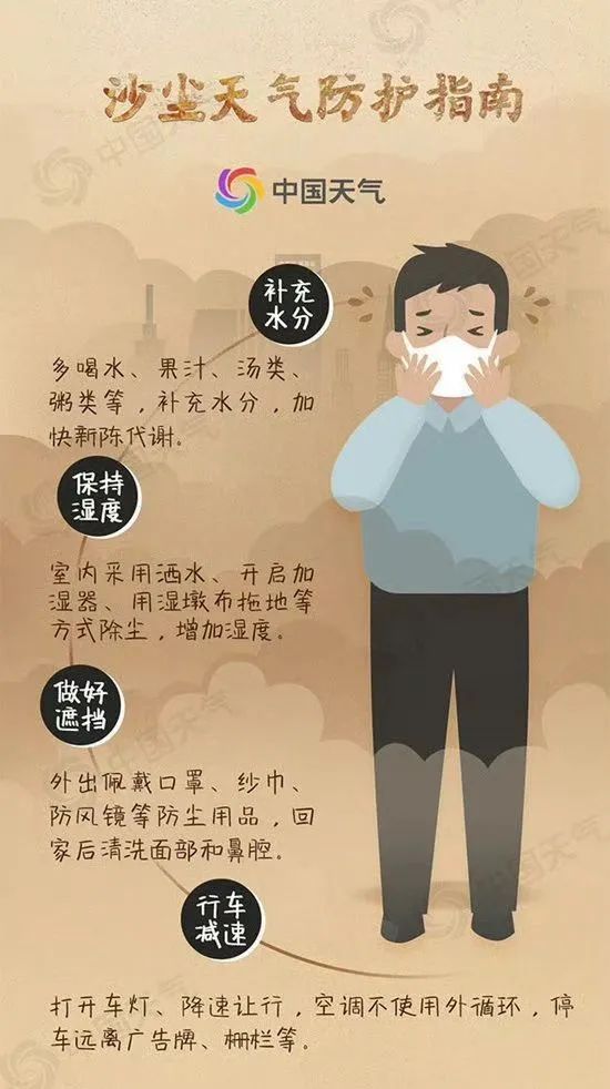 佩戴防护用品:如需外出,应佩戴口罩、纱巾、护目镜或风镜等防尘用品,避免沙尘进入呼吸道和眼睛。