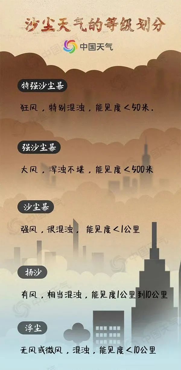 首先要厘清下,根据目前的预警,这次影响没到沙尘暴的程度,而是扬尘或浮尘,不会出现想象中遮天蔽日景象。