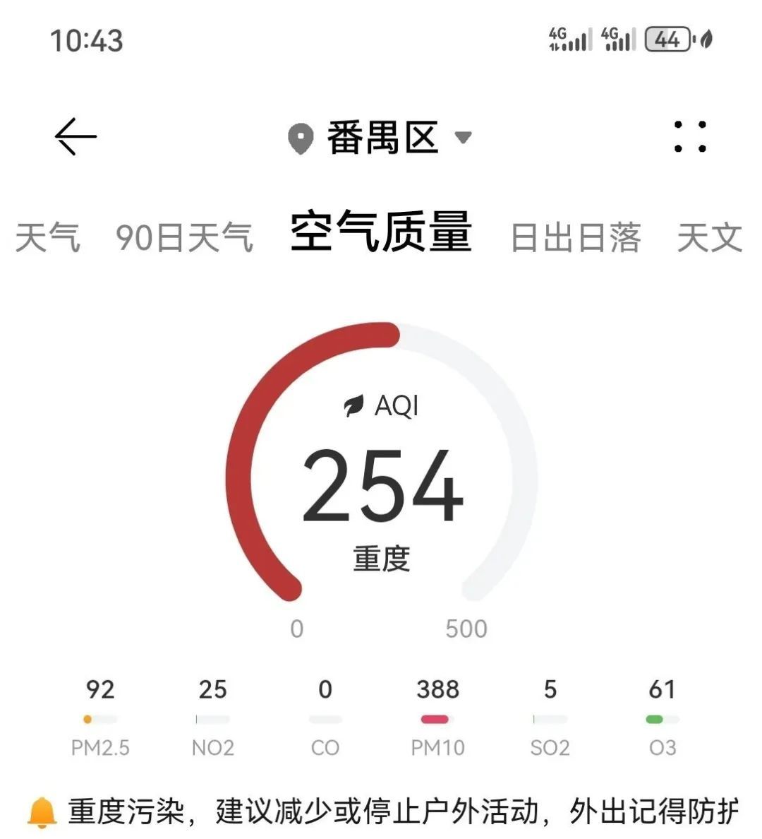 4月13日,广州市生态环境局发布消息,4月12日夜间起,广州受大范围沙尘天气影响,空气质量明显下降,超标污染物为PM10颗粒物。预计今天内沙尘过程将持续影响广州,建议儿童、老年人和病人尽量留在室内,避免体力消耗,一般人群避免户外活动。