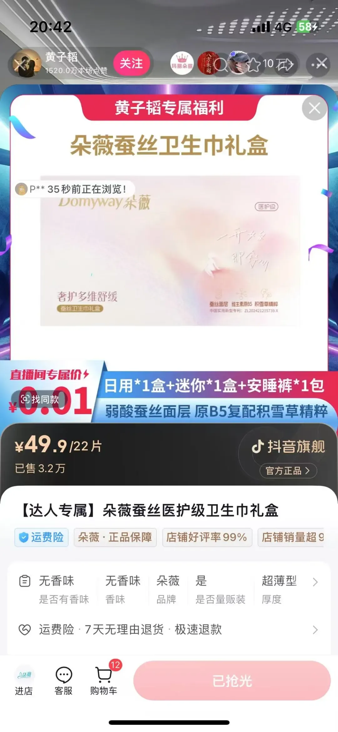 其抖音标价显示为49.9元,但黄子韬直播间人士表示,这并非定价,其称最后并不会以礼盒形式出售卫生巾,本次仅为使用。