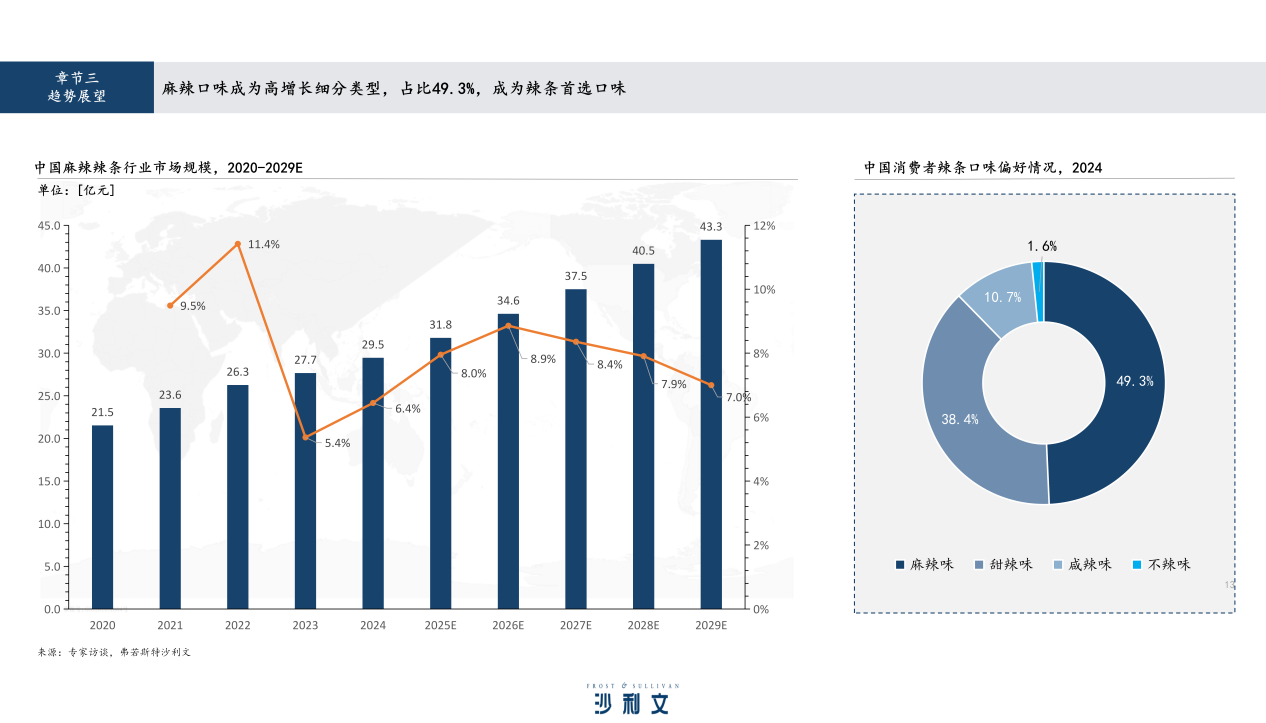 沙利文报告显示,强劲的辣条市场增势下,麻辣辣条以8%的市场规模增速迅速扩张。在2024年中国消费者辣条口味偏好情况调查中,选择将麻辣味作为辣条首选的消费者占比为49.3%。麻辣口味不仅是辣条市场增长最快的细分品类,也是辣条消费者首选口味。