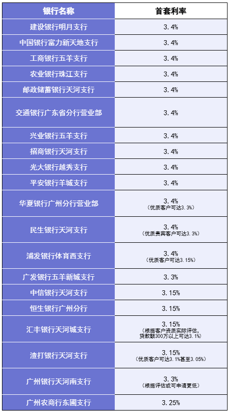 如民生银行天河支行、广发银行五羊新城支行、广州银行天河南支行等均表示最低利率可达3.3%;广州农商银行东圃支行首套最低利率为3.25%。