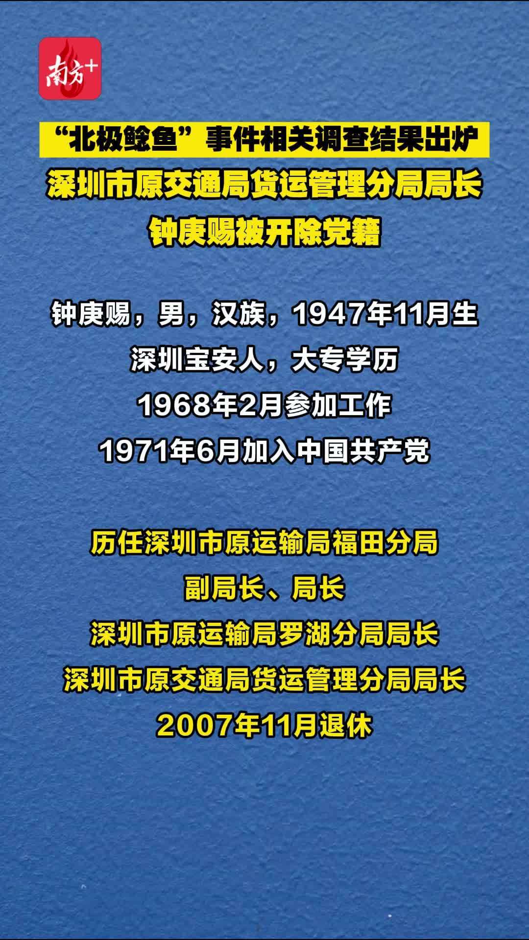 “北极鲶鱼”事件相关调查结果出炉:深圳市原交通局货运管理分局局长钟庚赐被开除党籍