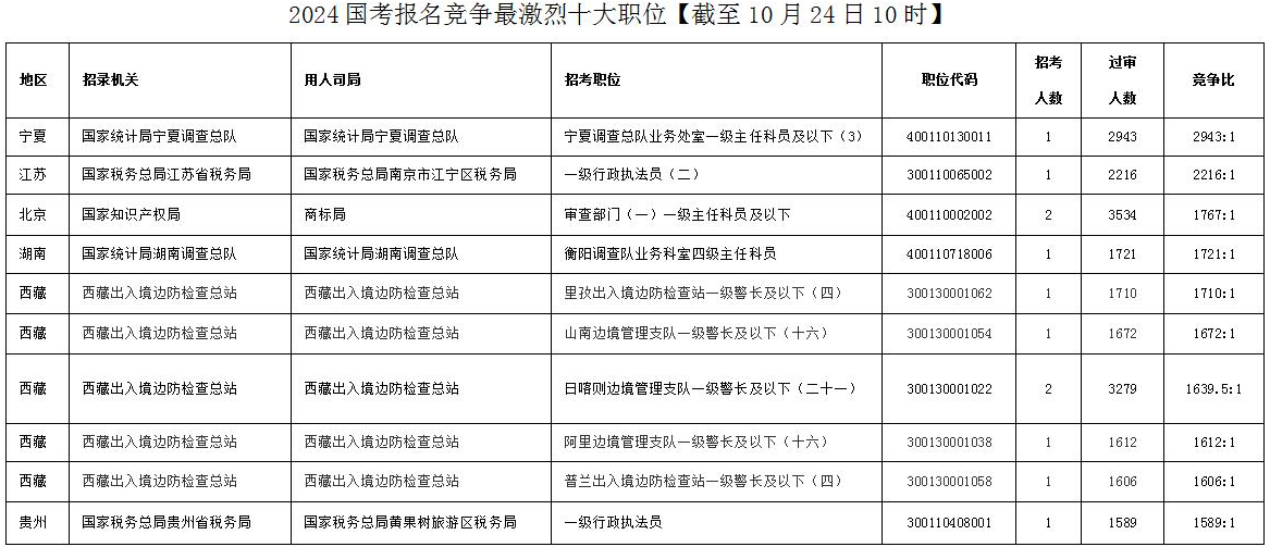 竞争前十榜单首位被“国家统计局宁夏调查总队业务处室一级主任科员及以下(3)(400110130011)”这一职位牢牢锁定,目前已经有2943人通过审核,竞争比高达2943:1,已经稳拿王冠。但在竞争最激烈前十榜单中最引人注意的是,有一半职位来自西藏出入境边防检查总站,竞争比例均超越1000:1。