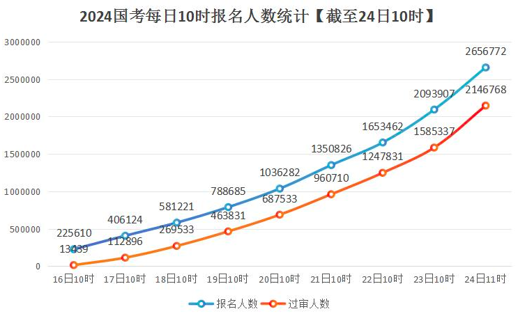 10月24日,2024国家公务员考试报名进入第十天,真正的收尾期到了。根据中公教育的统计,截至今日10时,报名系统中有2656772人提交报名申请,比上年同期增长了近40万,其中通过资格审核的有2146768人, 比上年同期增长了近25万人。平均竞争比为54:1,略高于上年同期的51:1。