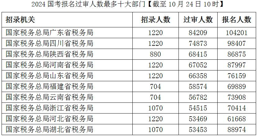 2024国考报名期间,人气最高的十个部门始终被税务系统“独霸”,位列前三的依旧是广东省税务局、四川省税务局和陕西省税务局,在榜单前十中最引人注意的是国家税务总局广东省税务局,是唯一一个过审人数超十万的部门。四川税务局紧随其后,过审人数也接近十万,其余部门过审人数均在9万以下,基本格局已经形成。