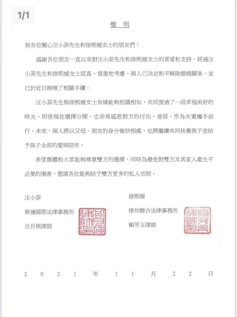 对婚变一事,大S和汪小菲今日首度通过律师发表联合声明,称双方已于近日办理了离婚手续,未来将以朋友身份愉快相处,并继续共同抚养孩子,希望媒体和大众能够尊重双方的选择。