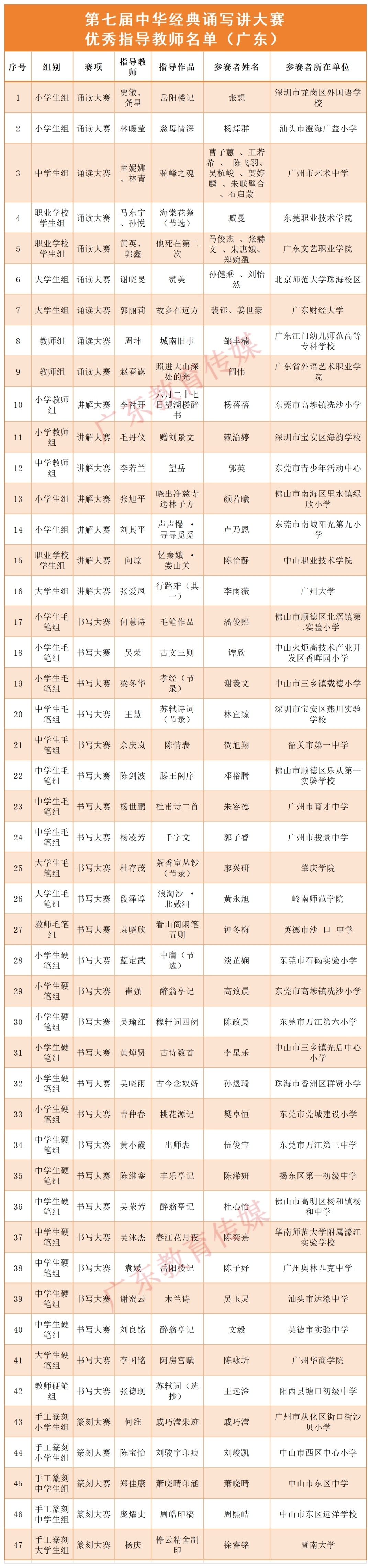 P.S. 如需快速查找作品是否获奖,可在“广东教育传媒”公众号对话框输入关键词“经典诵写讲”获取PDF版完整名单及证书下载通道。