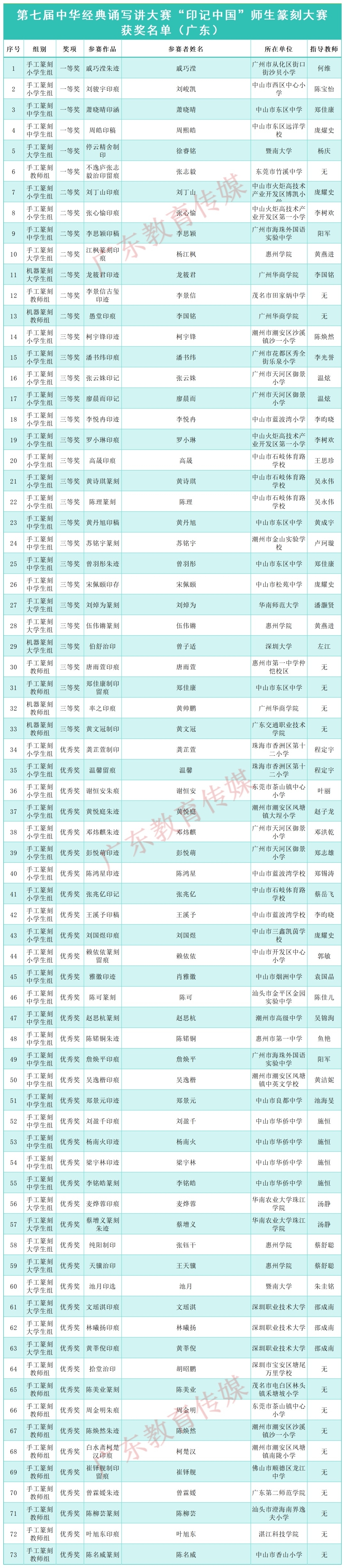 本次大赛我省选送的作品取得了优异成绩,在“诵读中国”经典诵读大赛、“诗教中国”诗词讲解大赛、“笔墨中国”汉字书写大赛、“印记中国”师生篆刻大赛四项赛事中共获得各种奖项635个。此外,5个单位和8个个人获得优秀组织奖,47名老师获优秀指导教师奖。接下来,一起看看广东都有哪些师生上榜!