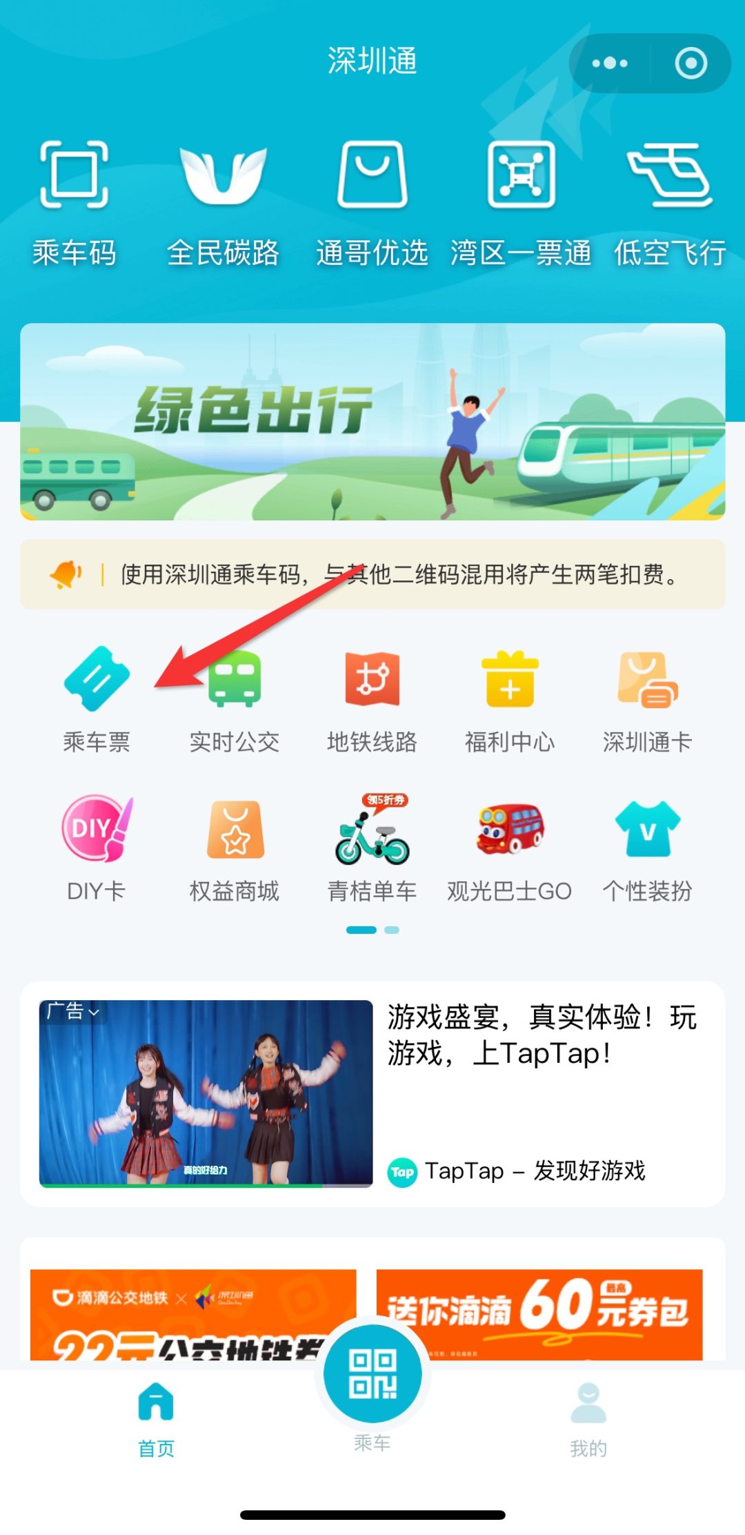 进入购票平台打开 “深圳通+”微信小程序 或 “深圳通”APP,进入首页。