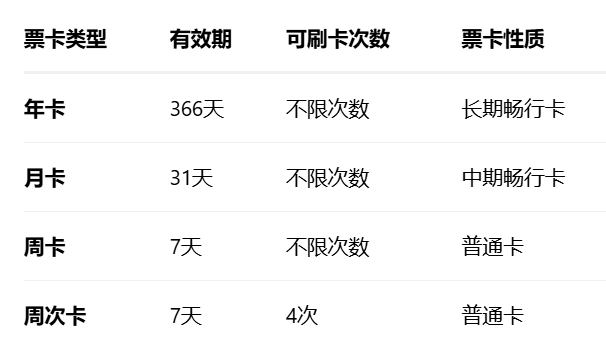 ✨年卡、月卡为不限次数的长期/中期畅行卡,适合高频出行人群。