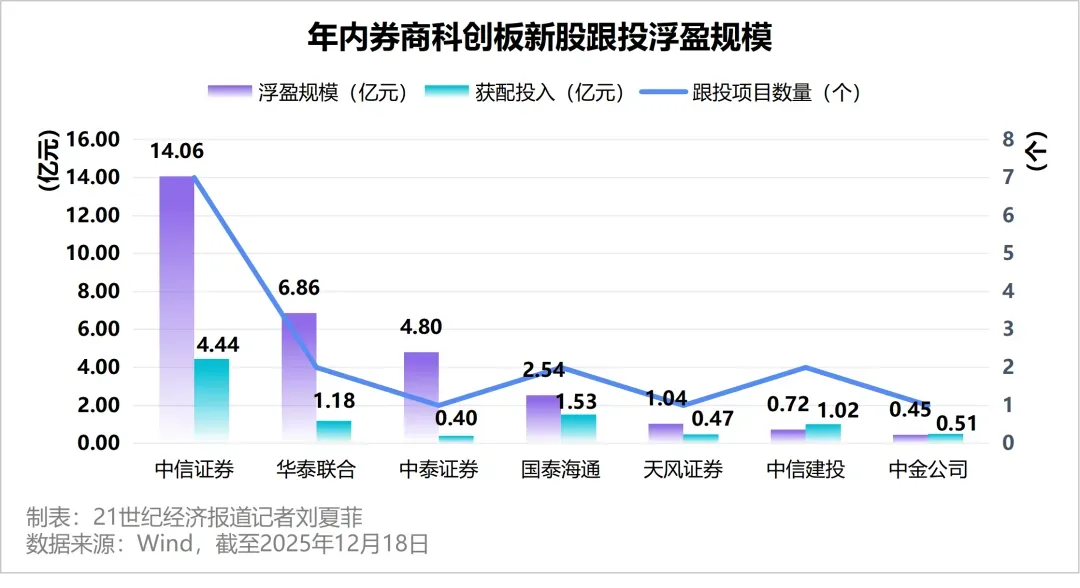 从跟投战绩来看,以12月18日的收盘价计算,16只新股目前已为上述7家保荐券商带来合计超过30亿元的跟投浮盈,其中有8个项目浮盈规模超1亿元。