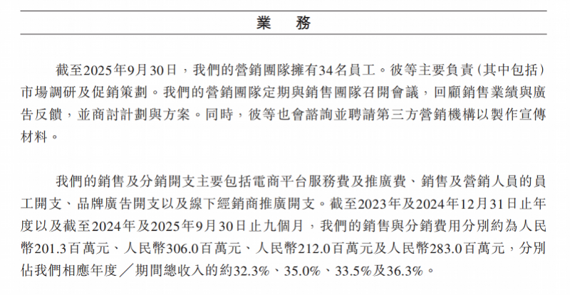根据招股书,爷爷的农场2024年、2025年前9个月的销售与分销费用分别约为人民币2.01亿元、3.06亿元、2.12亿元及2.83亿元;分别占相应年度总营收的32.3%、35.0%、33.5%及36.3%。也就意味着其一年的销售及分销费用加起来营收占比接近七成。