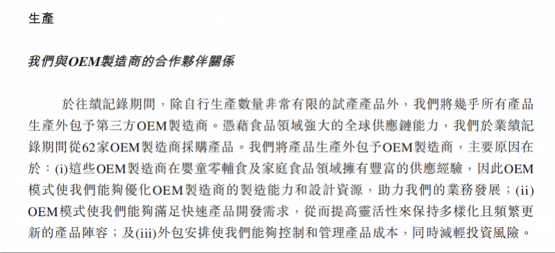 “于往绩记录期间,我们的绝大部分产品由OEM供应商生产。”爷爷的农场在招股书中这样写道,其合作的供应商数量达到62家,也就意味着其现有的269个SKU几乎都为代工生产。