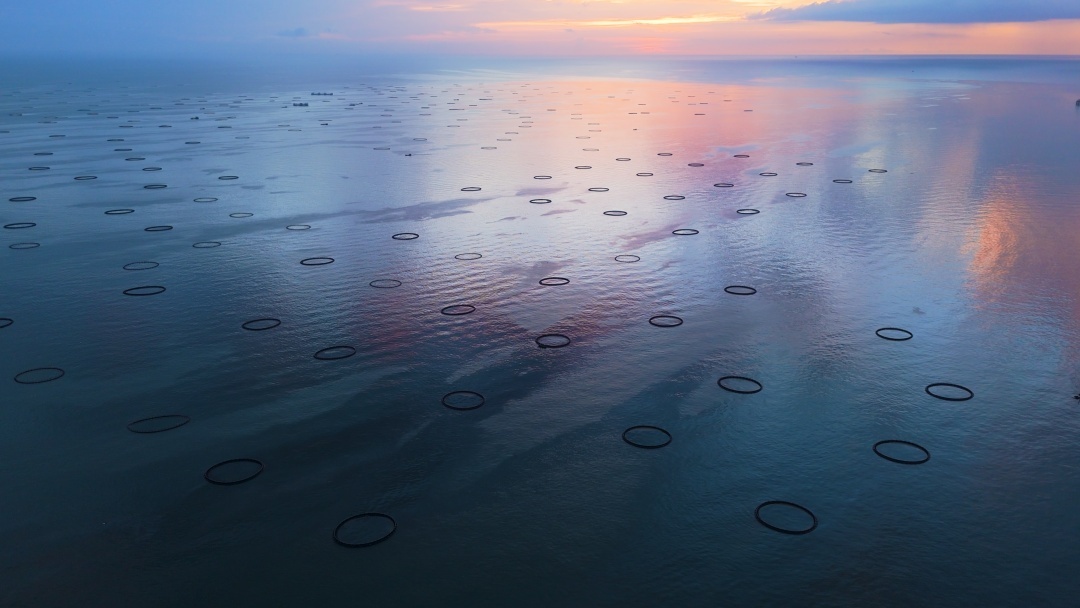 ▲港航集团位于湛江雷州流沙湾的现代化海洋牧场重力式网箱运营实况