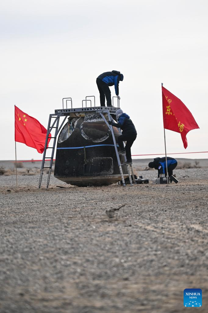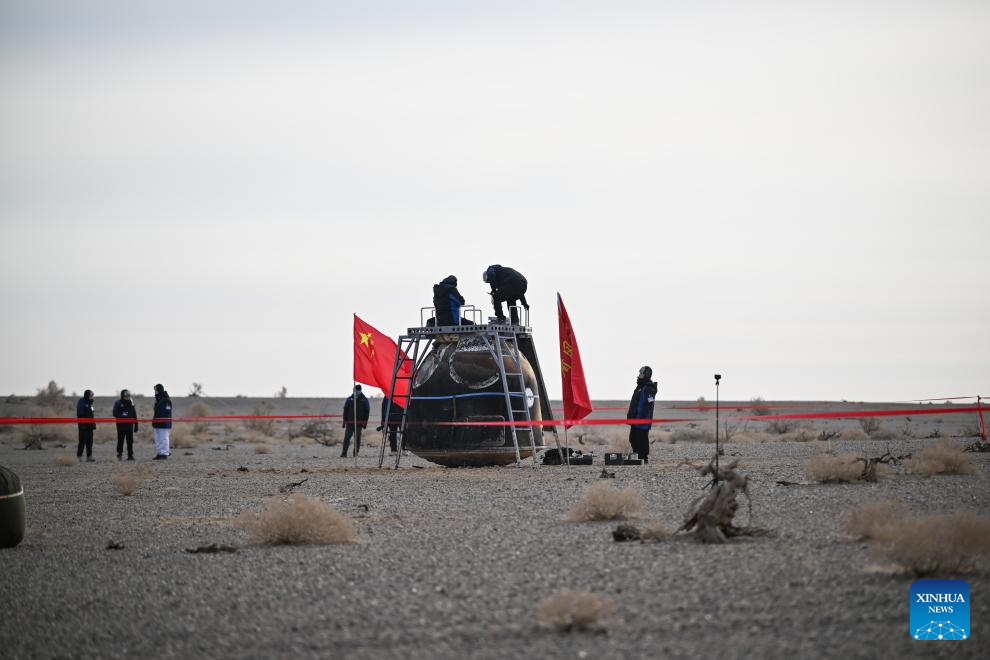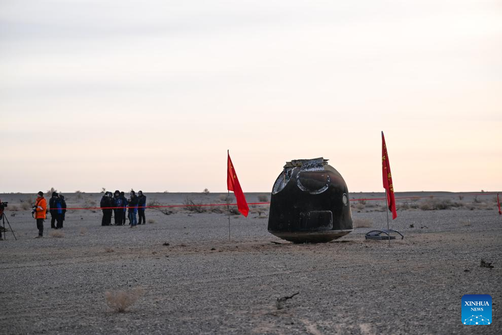 The return capsule of the Shenzhou-20 spaceship, carrying no astronauts, touched down at the Dongfeng landing site in north China's Inner Mongolia Autonomous Region at 9:34 a.m. (Beijing Time) on Monday, according to the China Manned Space Agency (CMSA).