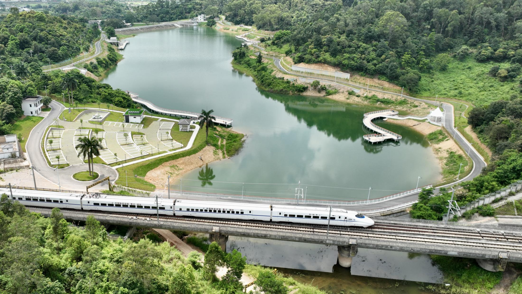 傍晚的东莞南站山水天地,120亩水库碧波荡漾,亲水栈道蜿蜒延伸,市民沿步道慢跑,孩童在草坪嬉戏,勾勒出城乡交融的生态画卷。