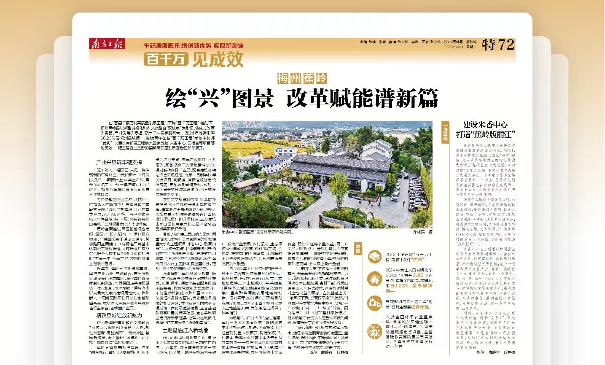 在“百县千镇万村高质量发展工程”(下称“百千万工程”)推动下,梅州蕉岭县以新型城镇化和农文旅融合“双试点”为引领、集成式改革为突破、产业发展为支撑,交出了一份亮眼答卷。2024年城镇化率60.23%居梅州县域第一,连续两年在省“百千万工程”考核中获评“优秀”,长潭水库扩建工程纳入国家战略,米香中心、云栖谷等项目落地见效,一幅宜居宜业宜游的县域高质量发展画卷正徐徐展开。
