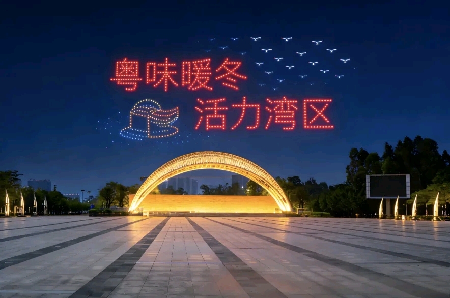 在傍晚时分,无人机编队腾空而起,在夜幕中相继展现出“我爱大亚湾”“2025暖冬嘉年华”等璀璨字样,光影交错,引来现场观众阵阵欢呼与持续拍照。