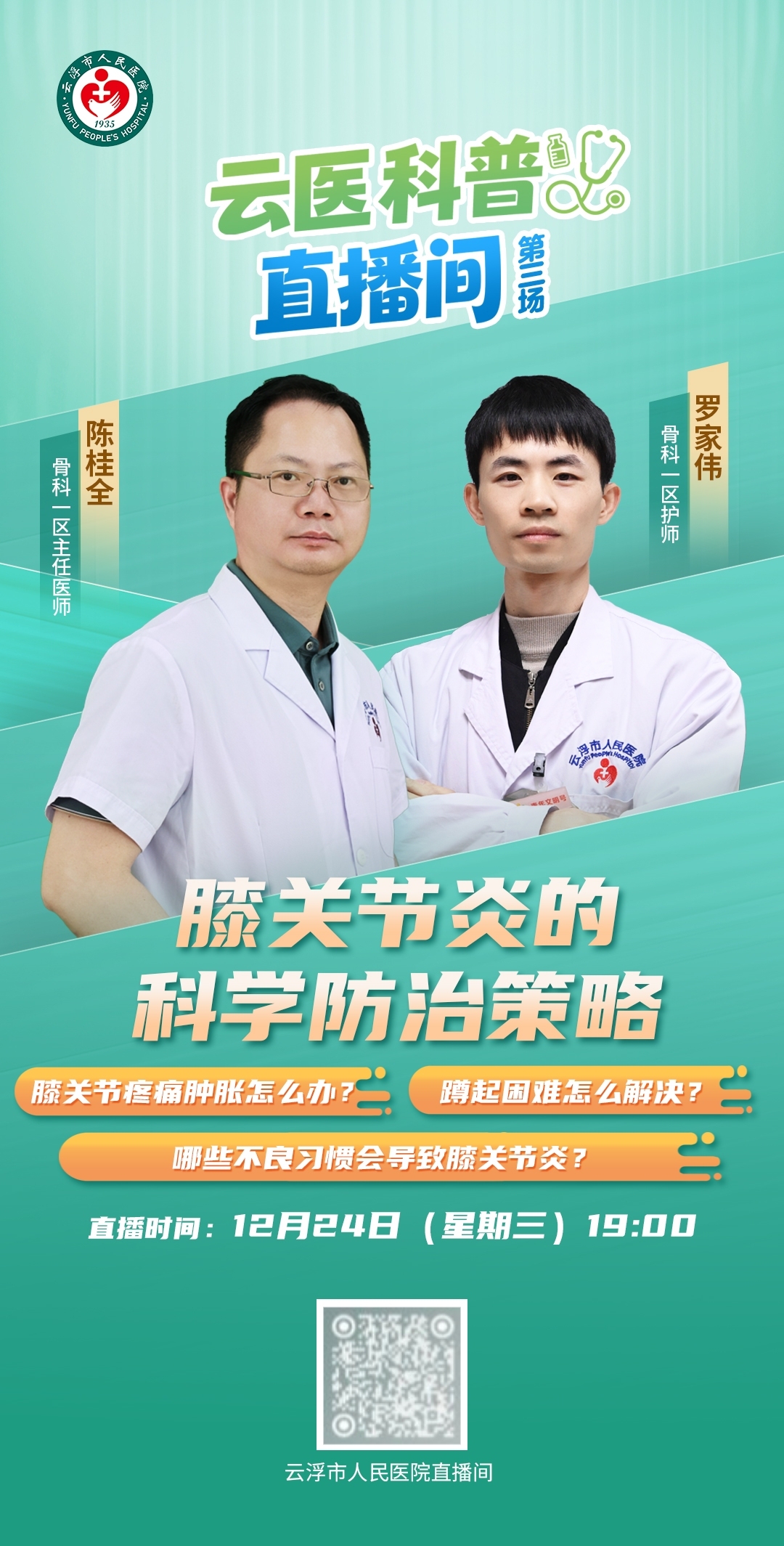 12月24日(星期三)19:00,云浮市人民医院第三场直播《膝关节炎的科学防治策略》准时开播。本次直播特别邀请到骨科一区主任医师陈桂全与骨科一区护师罗家伟,从专业医疗与日常护理双角度,为您系统讲解膝关节炎的防治知识,分享实用养护技巧,助您远离疼痛,轻松行走。