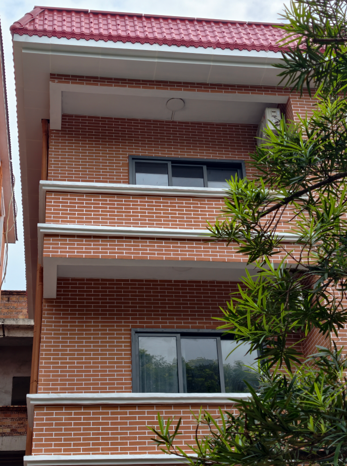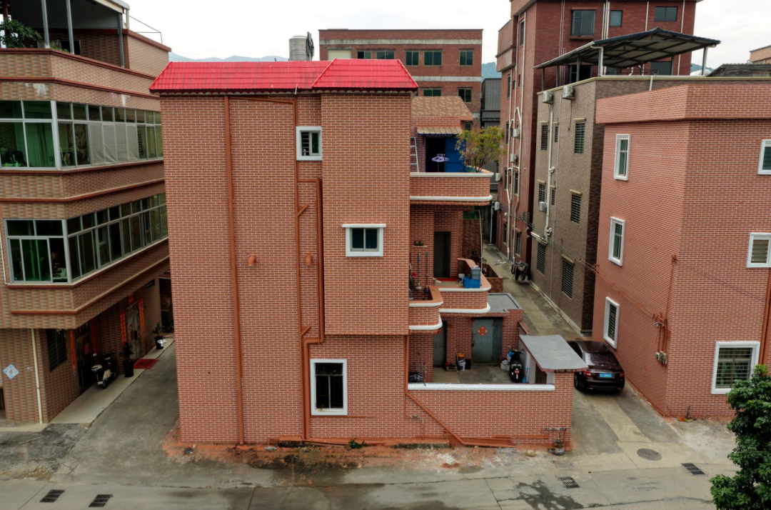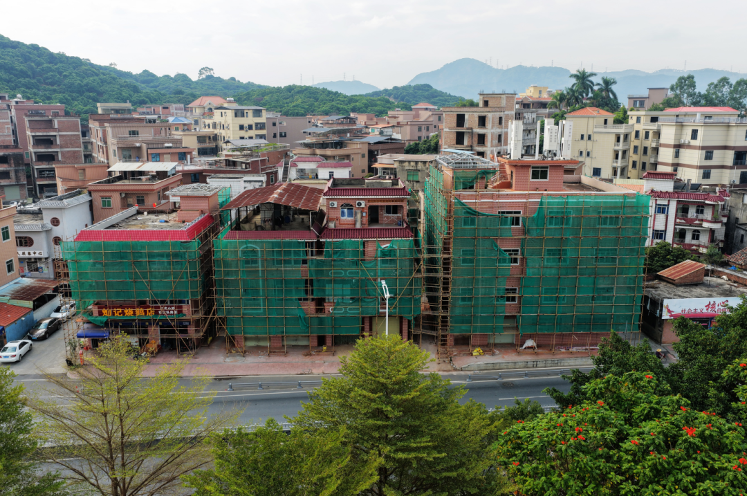 中式瓦顶、红色砖墙面……走进大迳社区厚大路厚街路段,工人师傅们正戴着安全帽搭外架,工地上呈现一片繁忙有序的景象。沿街两侧原本风格各异、颜色杂乱的居民房外立面,正换上外观统一色调舒适的“新装”,尽显大气美观。