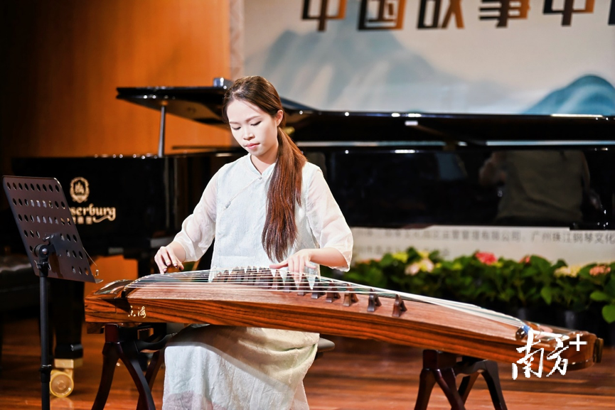 随后,香港中文大学(深圳)音乐学院研究生邰振宇用高亢明亮的男高音,演绎了《送人之岭南》和广东童谣《月光光》。激昂有力却不失温润的声音,如同穿透云层的晨光,在音乐厅久久回荡。特别是演唱广东童谣时,场景化、地域风味浓的歌声把岭南民俗与儿时印记表达得淋漓尽致。星海音乐学院研究生潘铬冰则带来古筝独奏《出水莲》《行云流水》,粤趣组合现场演奏了广东音乐五架头《走马》《平湖秋月》。