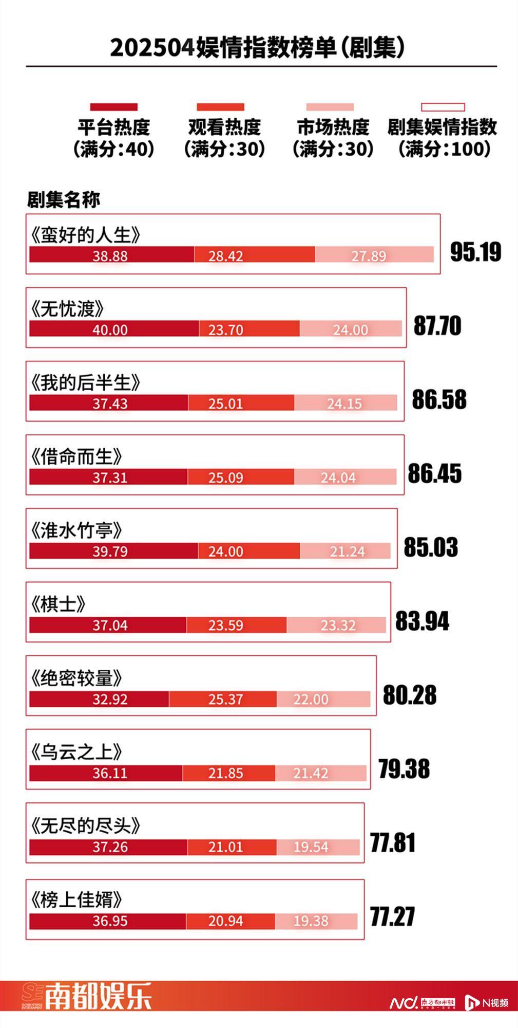 在本期娱情指数中,《蛮好的人生》凭借在观看热度与市场热度上的突出表现,以超7分优势强势登顶剧集分榜。古装奇幻剧《无忧渡》以独特的中式美学与单元叙事杀出重围,排名第二,凭借更高的播放量与平台传播影响力,在“平台热度”维度中力压一众剧集,获得最高分数,但也因结局争议和节奏流畅度而陷入口碑漩涡。横跨3、4月的剧集《我的后半生》和《棋士》连续两个月上榜,分列本期榜单的第三和第六名,人气依旧不俗。三部犯罪悬疑剧《借命而生》《绝密较量》与《乌云之上》也分别进入榜单前十。此外,根据国漫人气IP“狐妖小红娘”改编的《淮水竹亭》跻身前五,关于主演刘诗诗的演技与体态等争议不绝于耳。