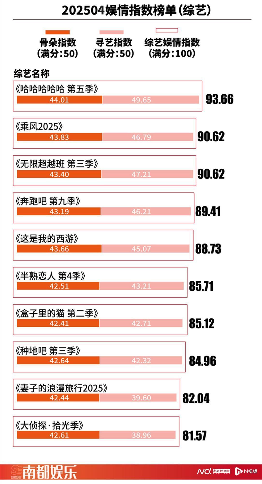 在本期综艺分榜,《哈哈哈哈哈 第五季》以93.66分成为冠军,话题性十足的《乘风2025》与《无限超越班 第三季》则以3分的差距分列第二、三位。两部新上榜的综艺《奔跑吧 第九季》和《这是我的西游》也进入前五强。