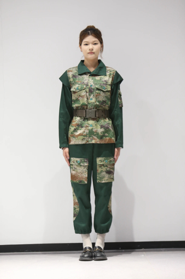 记者看到,入围的六套作品中,有五套都是迷彩服,还有一套是运动服。其中得票最多第六套是迷彩拼接墨绿,双膝和上臂还有大口袋,显得标新立异。而贴出的设计理念为:“这套服装巧妙结合军事与时尚,以军绿为主色调,迷彩拼接和多口袋设计增添实用性和视觉层次。宽松袖型和束脚裤型展现复古与现代休闲感,整体造型致敬经典,符合年轻人时尚个性需求。 ”