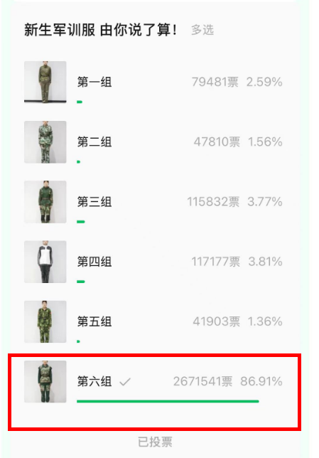 军训服创意设计大赛本是让学生们投票,为下一届的学弟学妹们票选出学生们心中最好的军训服,但该投票链接经学生转发至社交平台后迅速发酵。不少网友“恶搞”学弟学妹,自发号召“给学校一点土味震撼”,“06号”送上榜首。截至发稿前,“06号”投票人数超230万,远超第二名的10.4万票。