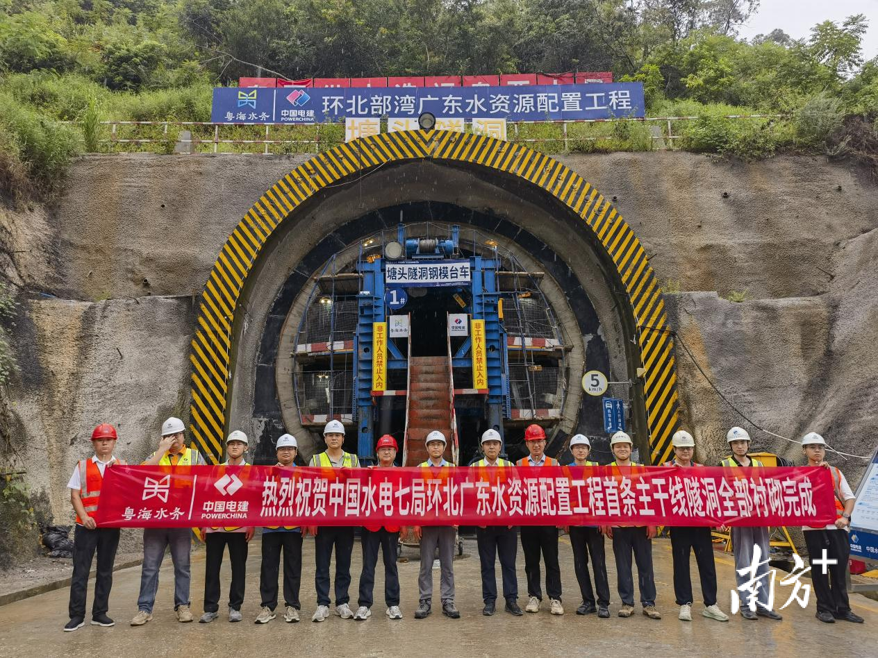 8月24日,环北广东工程首条主干线隧洞——塘头隧洞在高州市大井镇塘头村顺利完成衬砌混凝土施工。施工B1标引水主洞全长为16.65公里,其中塘头隧洞全长1140米,采用钻爆法施工。塘头隧洞作为全线首条贯通输水主隧洞,于2024年6月10日正式启动衬砌混凝土浇筑。为保证衬砌施工顺利进行,项目部制定了严格的施工计划,同时联合多家单位成立“塘头隧洞衬砌质量提升党员先锋队”,多次邀请外部专家进行专题研究,严格把控材料质量,推动技术创新,采取专人盯仓的方式,对混凝土的浇筑质量进行严格跟踪把控,重点控制混凝土塌落度、和易性、施工振捣和养护环节,紧抓工序衔接,较原定节点工期提前25天完成衬砌施工,为环北广东工程建设按下加速键。