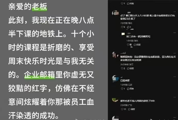 部分员工在社交媒体吐槽:“本来加班就烦,收到老板从南极发来的鸡汤信更崩溃”。有员工晒出加班至23点的工作记录,讽刺信中“南极24小时阳光”与自身“24小时压力”的对比。一封传播较广的员工信中写道:亲爱的老板,此刻,我现在正在晚八点半下课的地铁上,十个小时的课程是折磨的、享受周末快乐时光是与我无关,企业邮箱里你虚无又狡黠的红字,仿佛在不经意间炫耀着你那被员工血汗染透的成功。