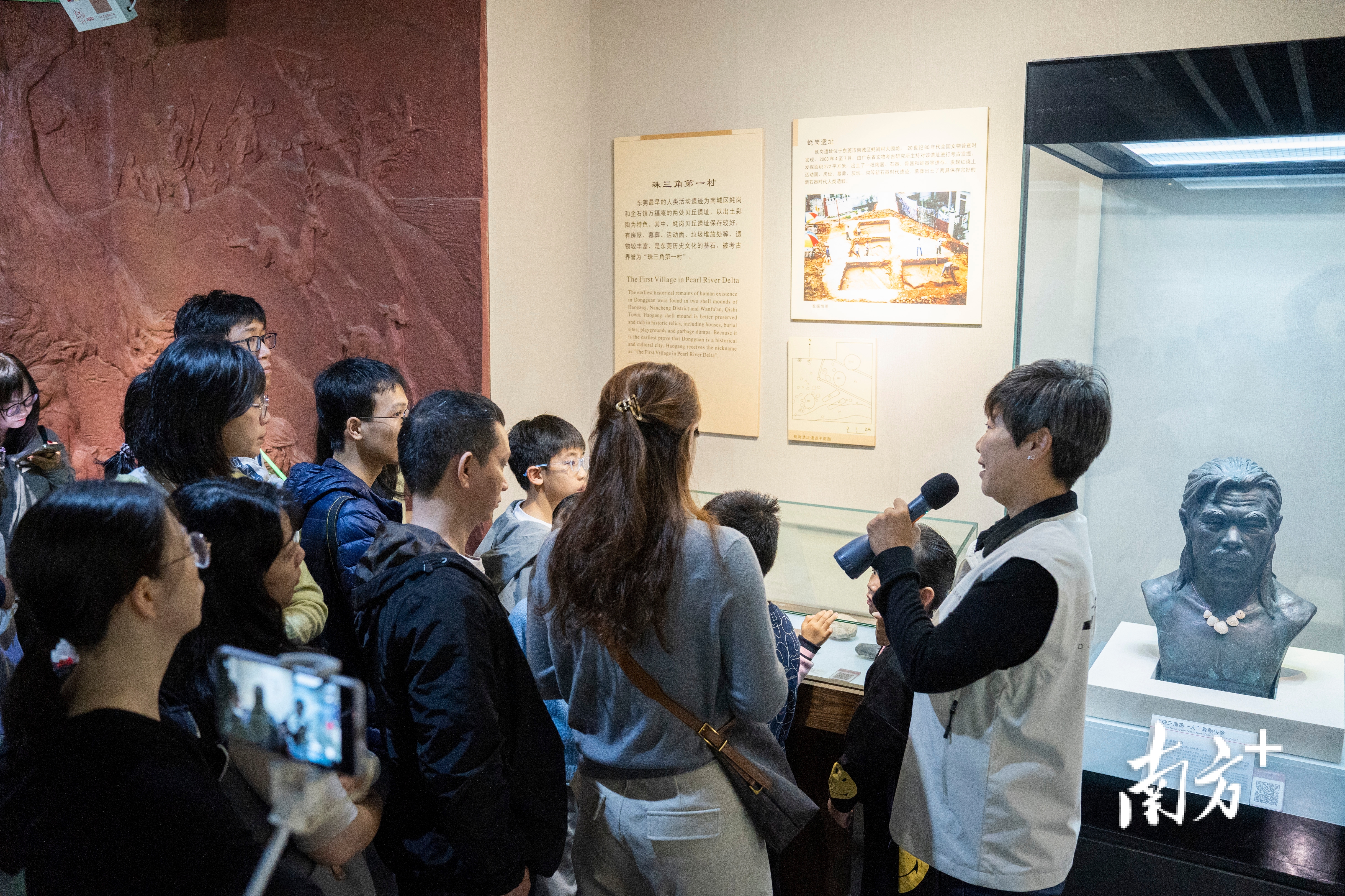 9点40分,王嘉茵带领观众走进《古代东莞》基本陈列,从五千年前的文明曙光开篇。十分钟后,曹宏自然接过话筒,将观众带回“珠三角第一村”的考古现场。讲解如溪流推进,每十分钟更换一名讲述者,“交接棒”时现场总响起自发的掌声。