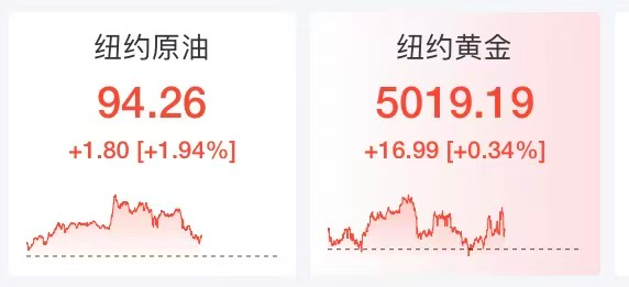 国际油价全天高位震荡,截至发稿,涨幅快速回落,WTI原油日内涨幅收窄至近2%,报94.26美元/桶,此前一度涨超5%。