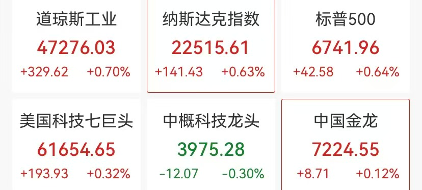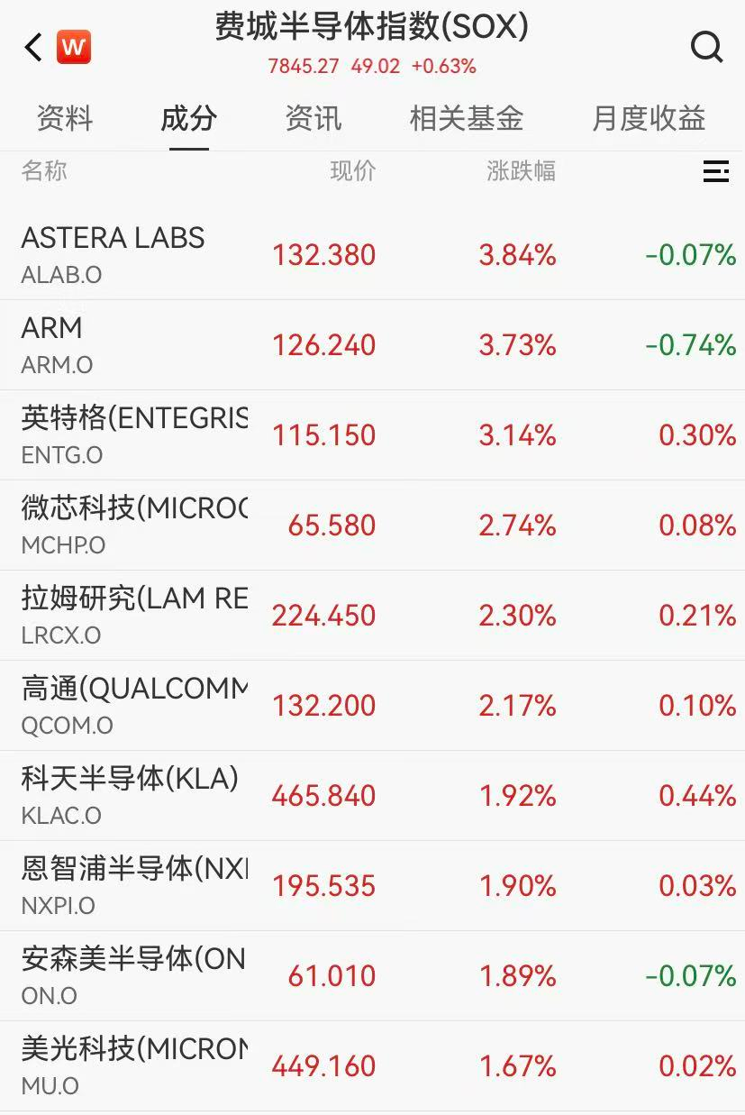 芯片股普涨,费城半导体指数涨超0.6%。高通涨超2%,其批准200亿美元股票回购计划并上调股息;ARM涨超3%,闪迪涨超2%,美光科技涨超1%。