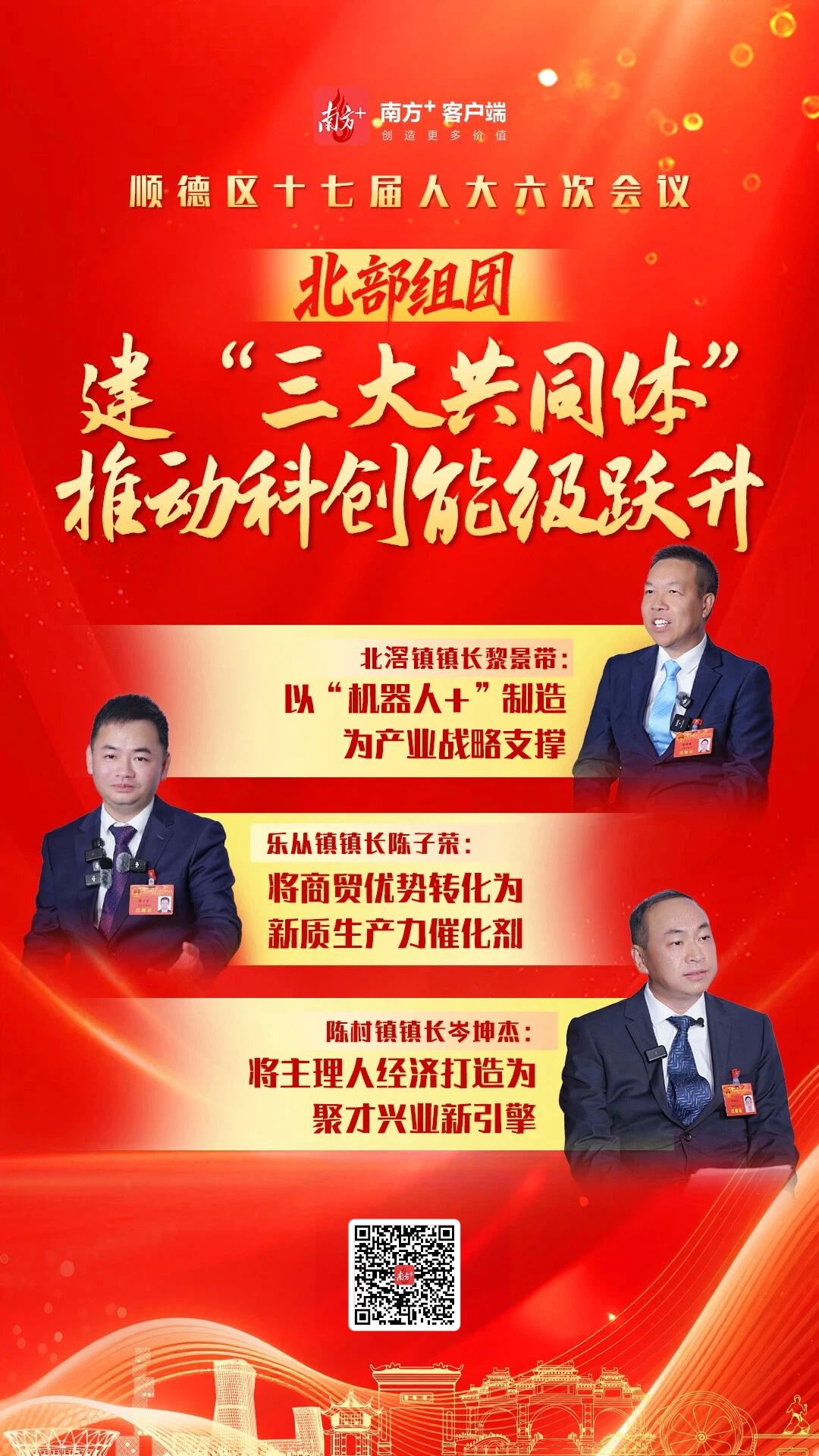 “通过三镇共建三大发展共同体,我们希望推动技术、资金、人才、项目等要素跨镇高效流动、优化配置,从而实现产业引人、城市留人、文化聚人,并推动科创能级跃升。”顺德区人大代表、北滘镇党委副书记、镇长黎景带说。