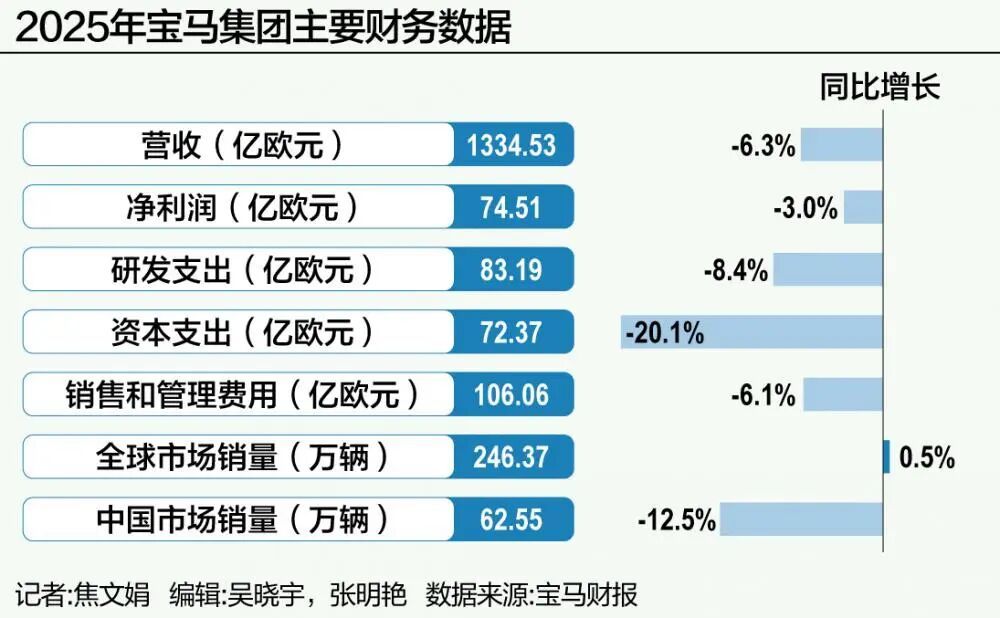 在全球销量稳住的同时,宝马的营收和利润却在下滑。2025年总营收1334.53亿欧元,同比下降6.3%;税前利润102.36亿欧元,同比下降6.7%;净利润74.51亿欧元,同比下降3.0%。