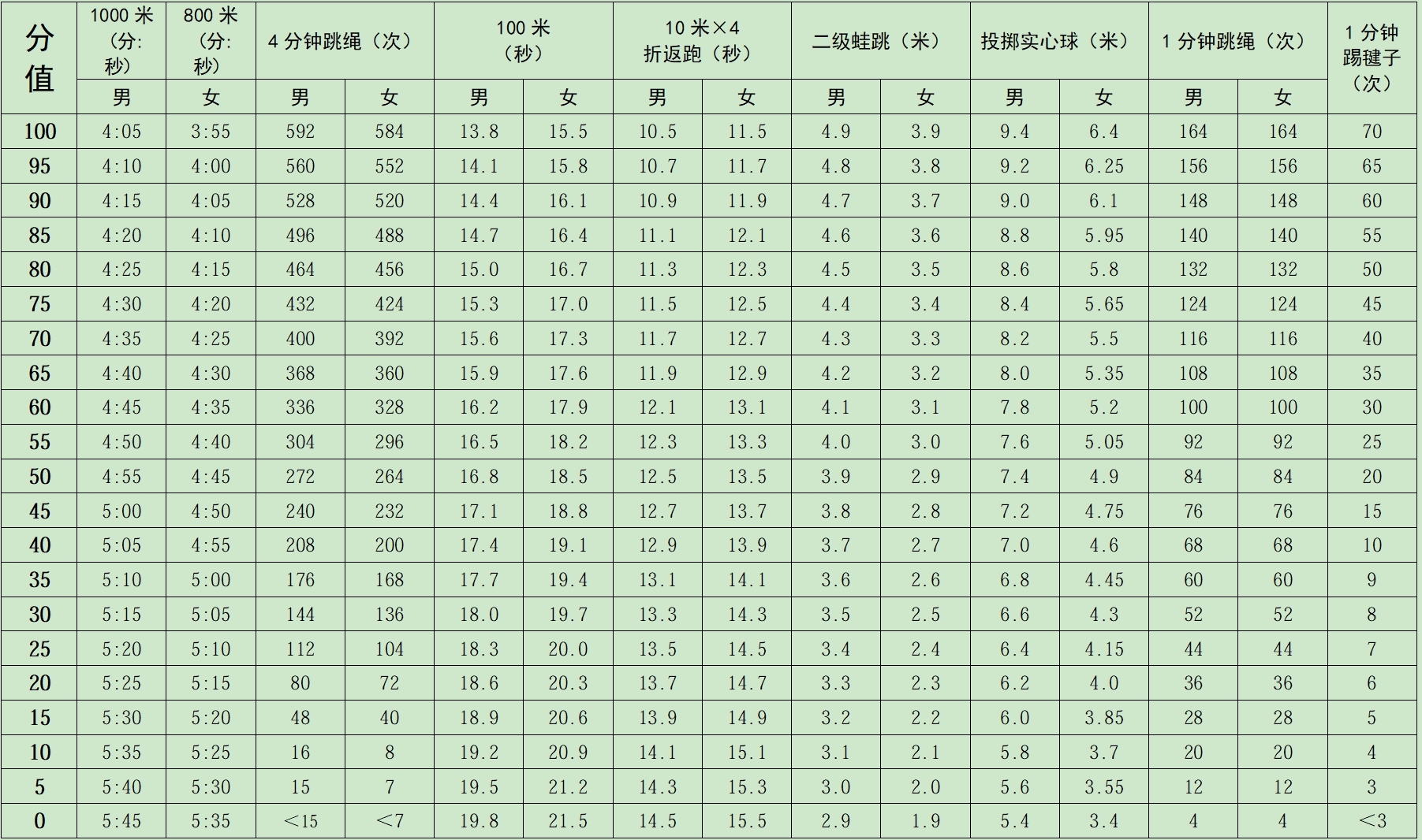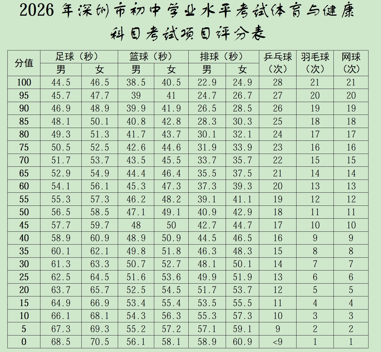 2026年深圳市初中学业水平考试体育与健康科目考试项目评分标准。