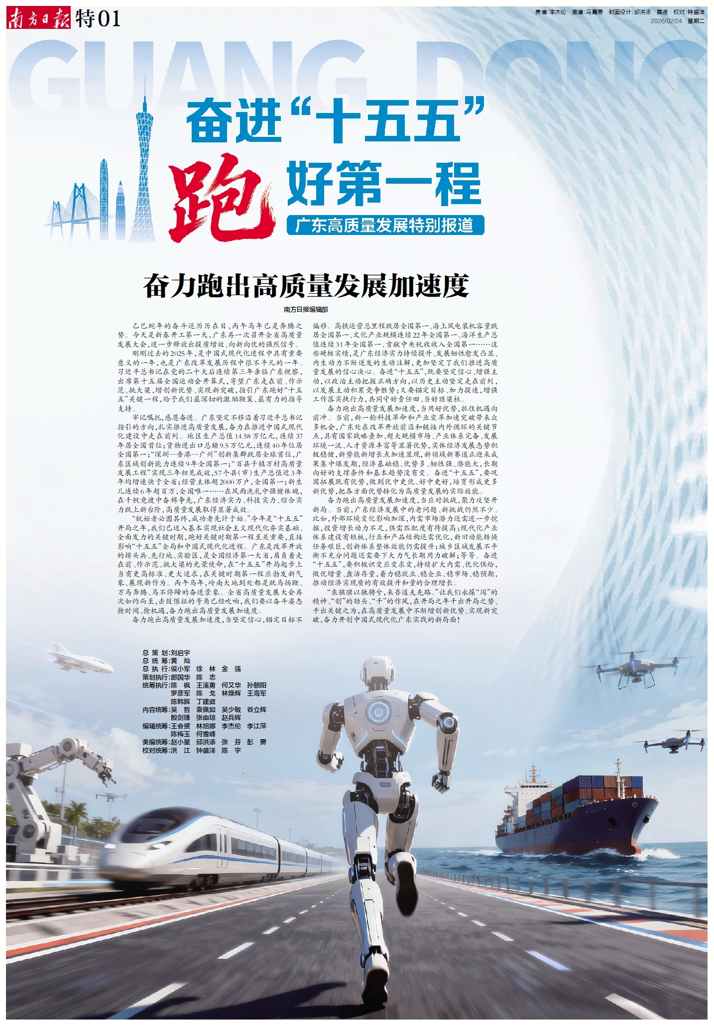 “锐始者必图其终,成功者先计于始。”今年是“十五五”开局之年,我们已迈入基本实现社会主义现代化夯实基础、全面发力的关键时期,跑好关键时期第一程至关重要,直接影响“十五五”全局和中国式现代化进程。广东是改革开放的排头兵、先行地、实验区,是全国经济第一大省,肩负着走在前、作示范、挑大梁的光荣使命,在“十五五”开局起步上当有更高标准、更大追求,在关键时期第一程应勃发新气象、展现新作为。丙午马年,岭南大地到处都是跃马扬鞭、万马奔腾、马不停蹄的奋进景象。全省高质量发展大会再次如约而至,击鼓催征的号角已经吹响,我们要以奋斗姿态抢时间、抢机遇,奋力跑出高质量发展加速度。