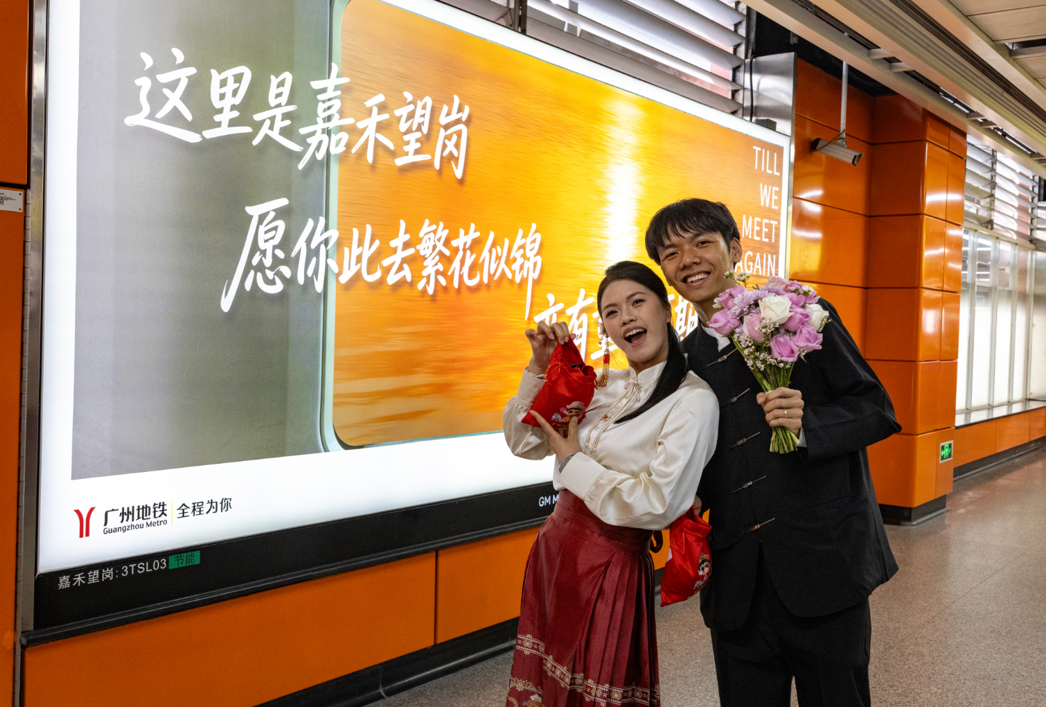 “听过《嘉禾望岗》的离别,更懂‘家和旺岗’的珍贵。”新人小严与小江的爱情故事,正是这场城市情感改写的生动注脚。两人从校服到婚纱,携手走过近九年时光,嘉禾望岗地铁站曾是他们每周相约的“圆心”——彼时一人在白云江高念书、一人在佛山打拼,这座站台承载了他们所有的牵挂与重逢。如今,他们选择在白云机场宣誓结婚,让曾经见证分别与等待的交通枢纽,正式成为他们承诺相守一生、奔赴永恒未来的起点。“就像当年在嘉禾望岗相互等待一样,今天我们在机场奔赴共同的未来。这里是广州送给我们的浪漫礼物。”他们开心表示。