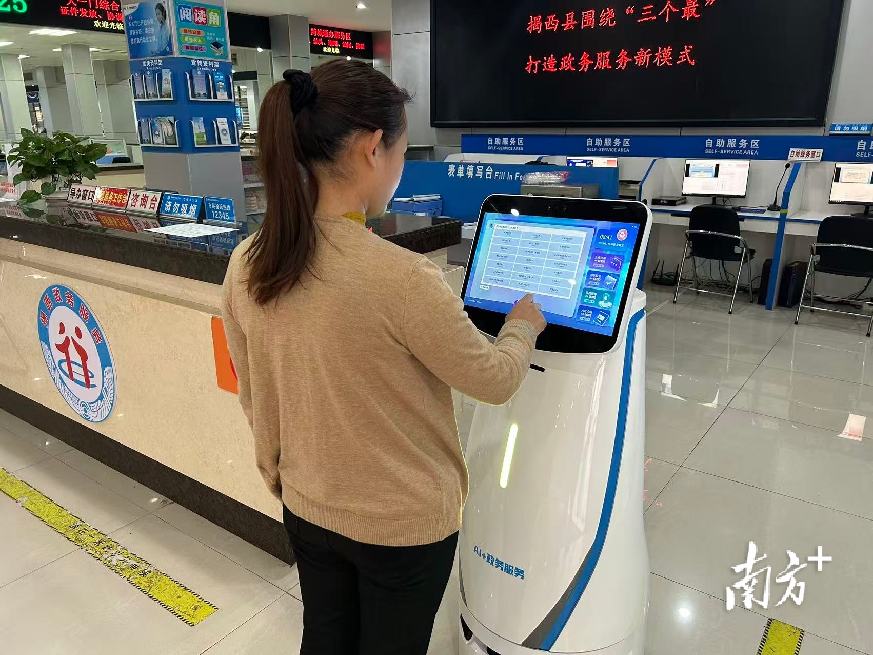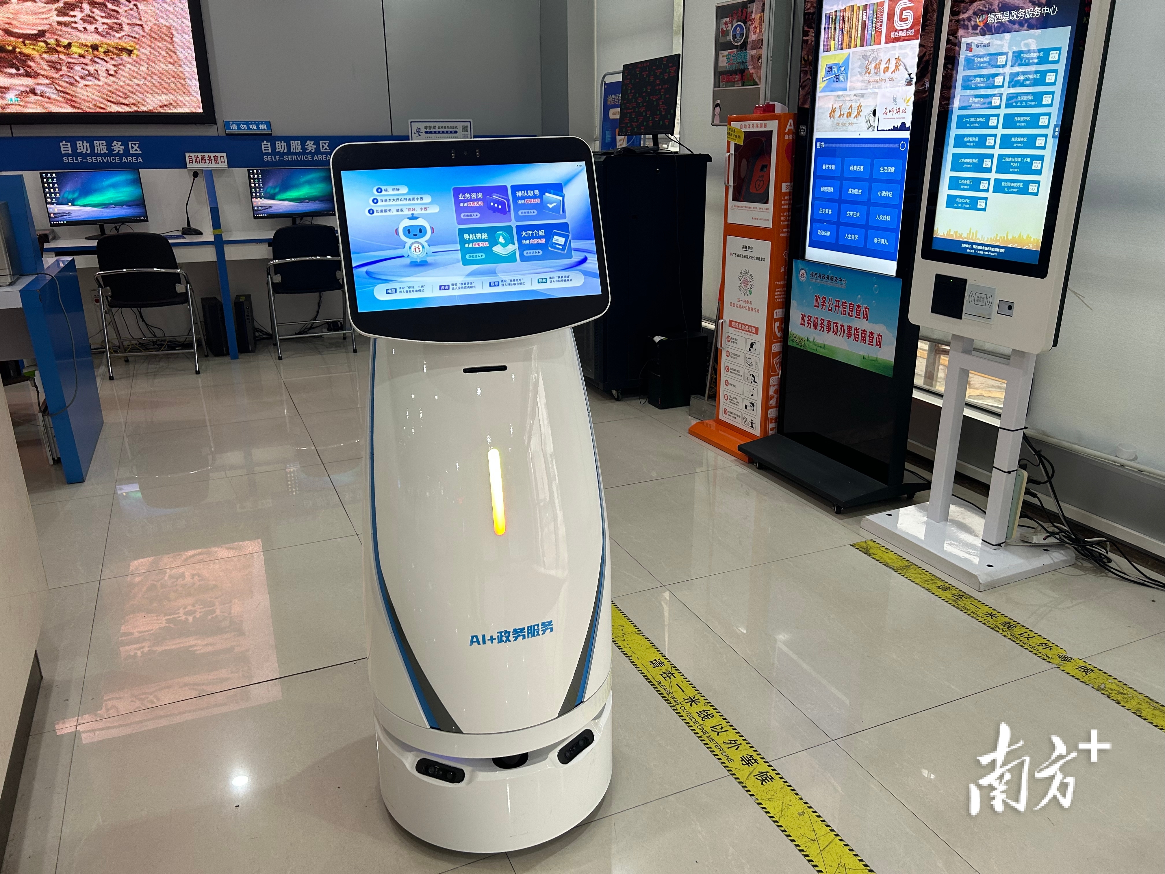 通透明亮的揭西县政务服务中心内,人流有序穿梭,一台搭载柔和语音系统、线条流畅的AI政务服务机器人“小西”正灵活移动,主动迎向办事群众与企业办事人员:“嗨,我是本大厅AI导询员小西,我可以提供业务咨询、智能导办、排队取号、导航带路等。”