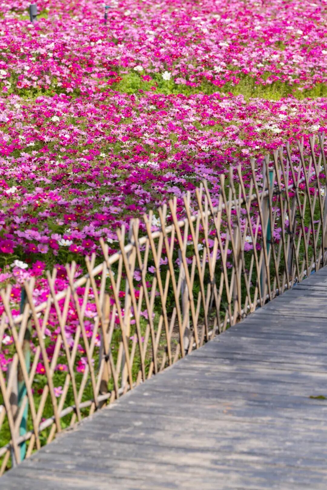 正值春节期间,花畔塔影的波斯菊花海正开得浩浩荡荡,从脚下一直铺到天边。千朵万朵波斯菊迎风怒放,蜜蜂还流连在花蜜间。