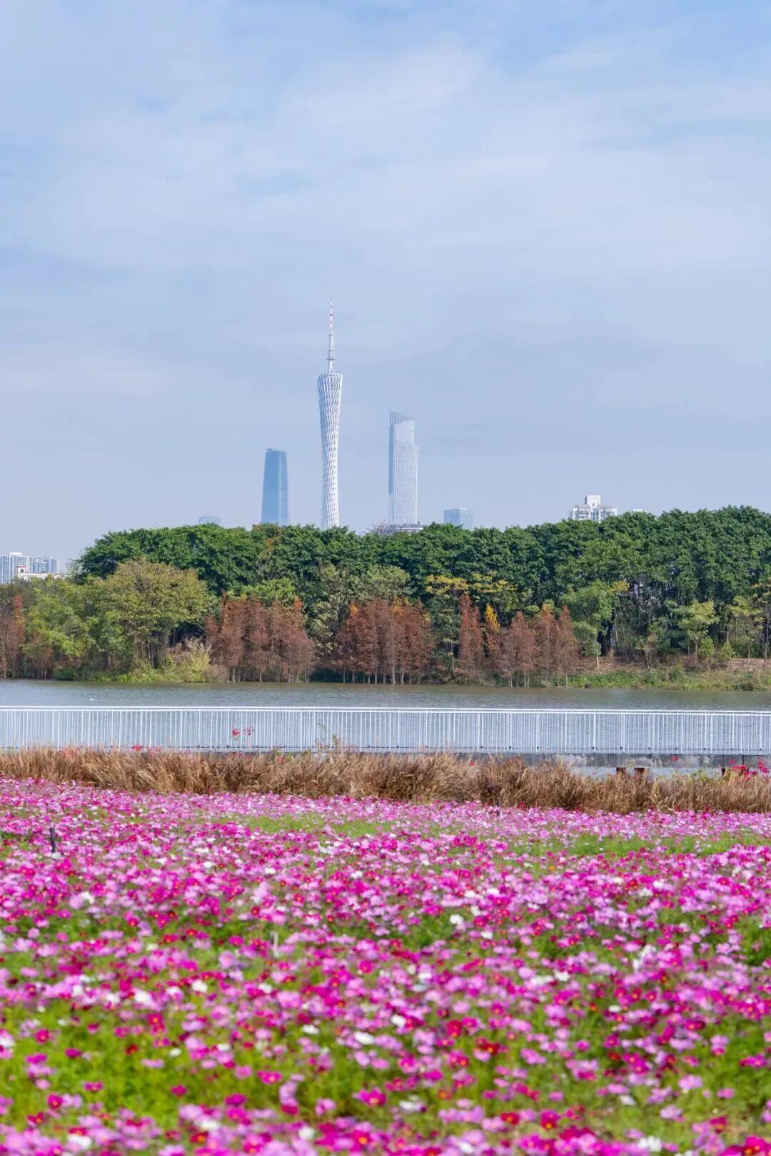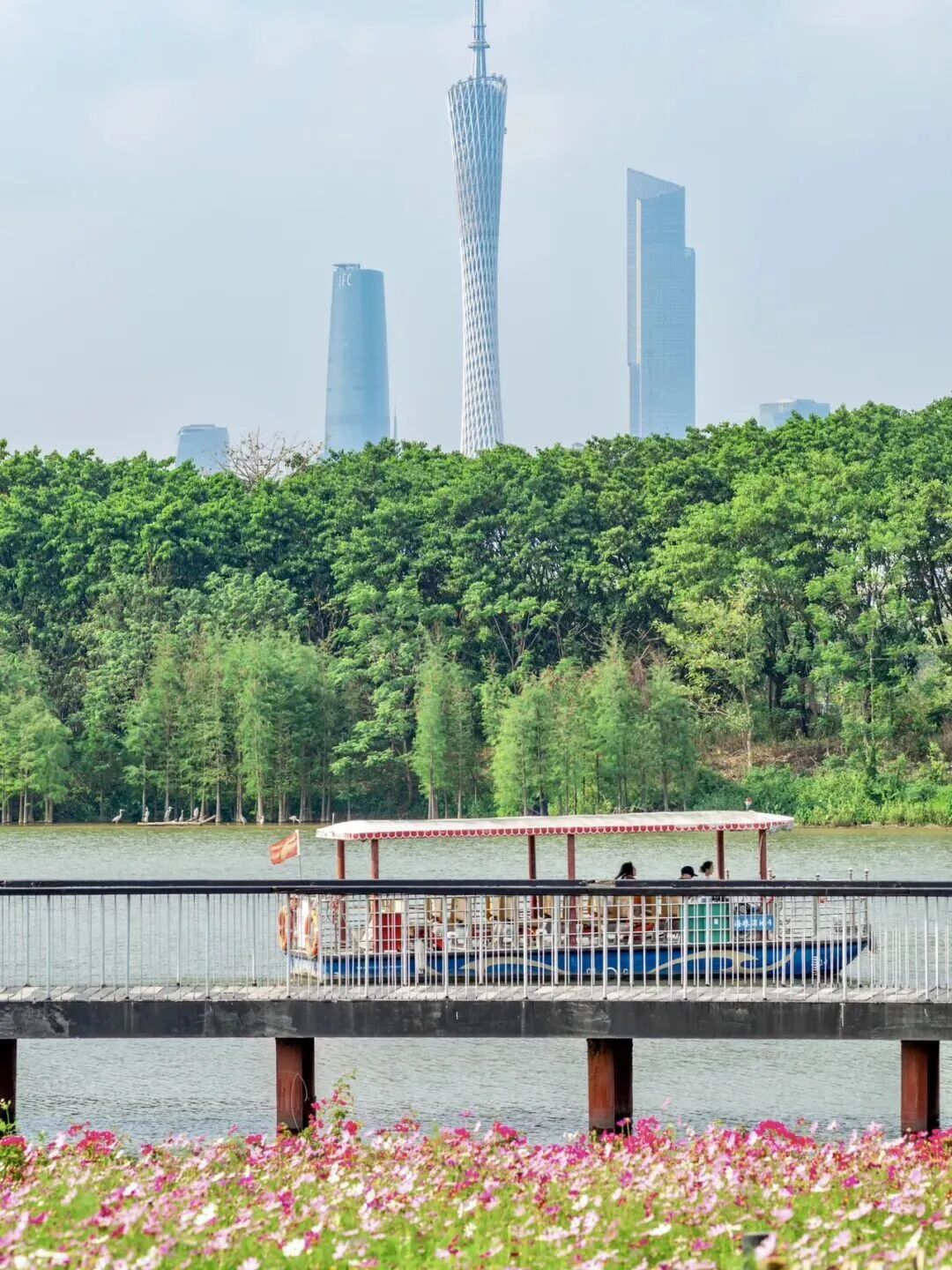 而花畔塔影,更是景如其名,这里可以拍到经典“广州三件套”广州塔、东塔、西塔“同框”。