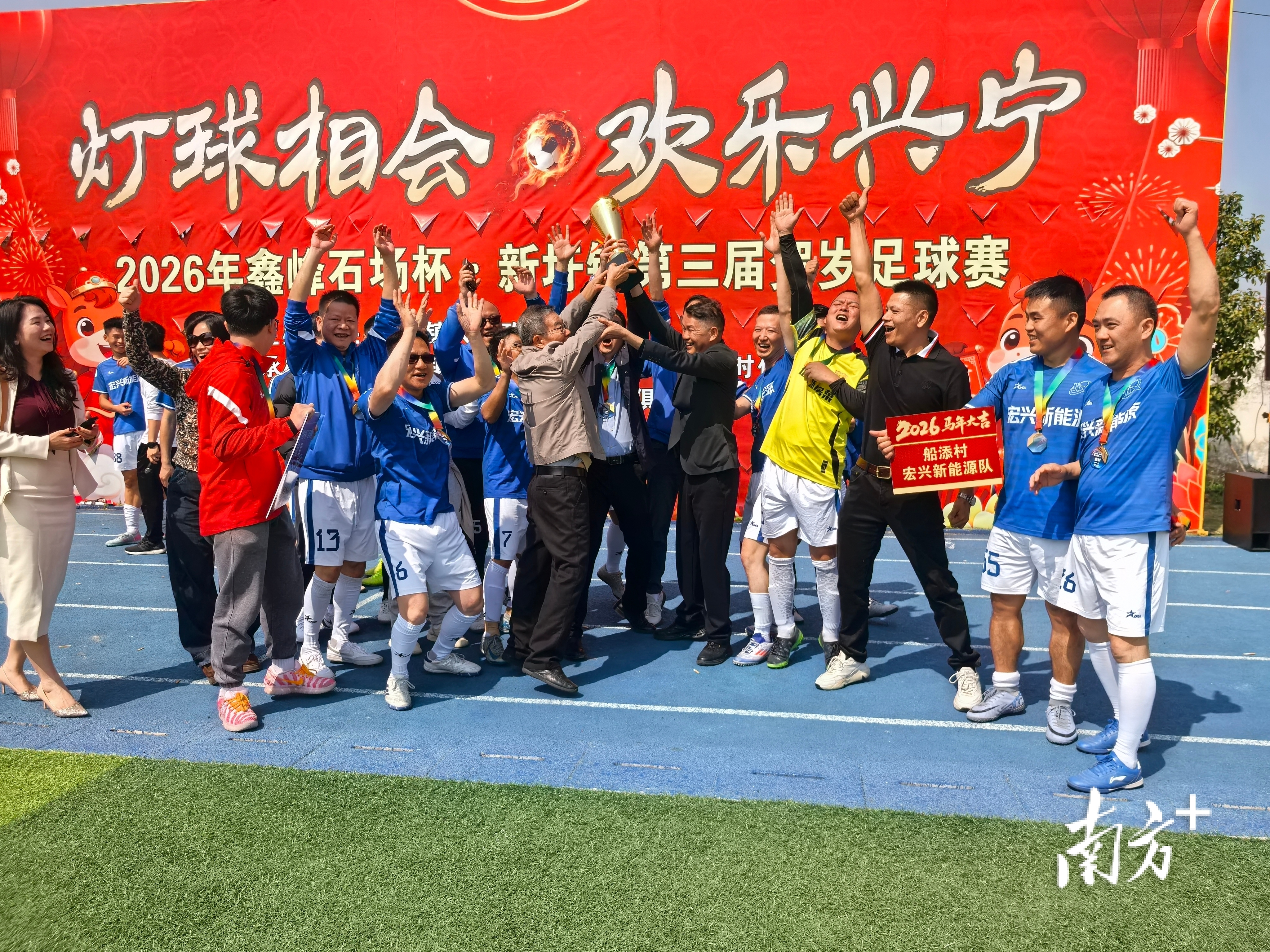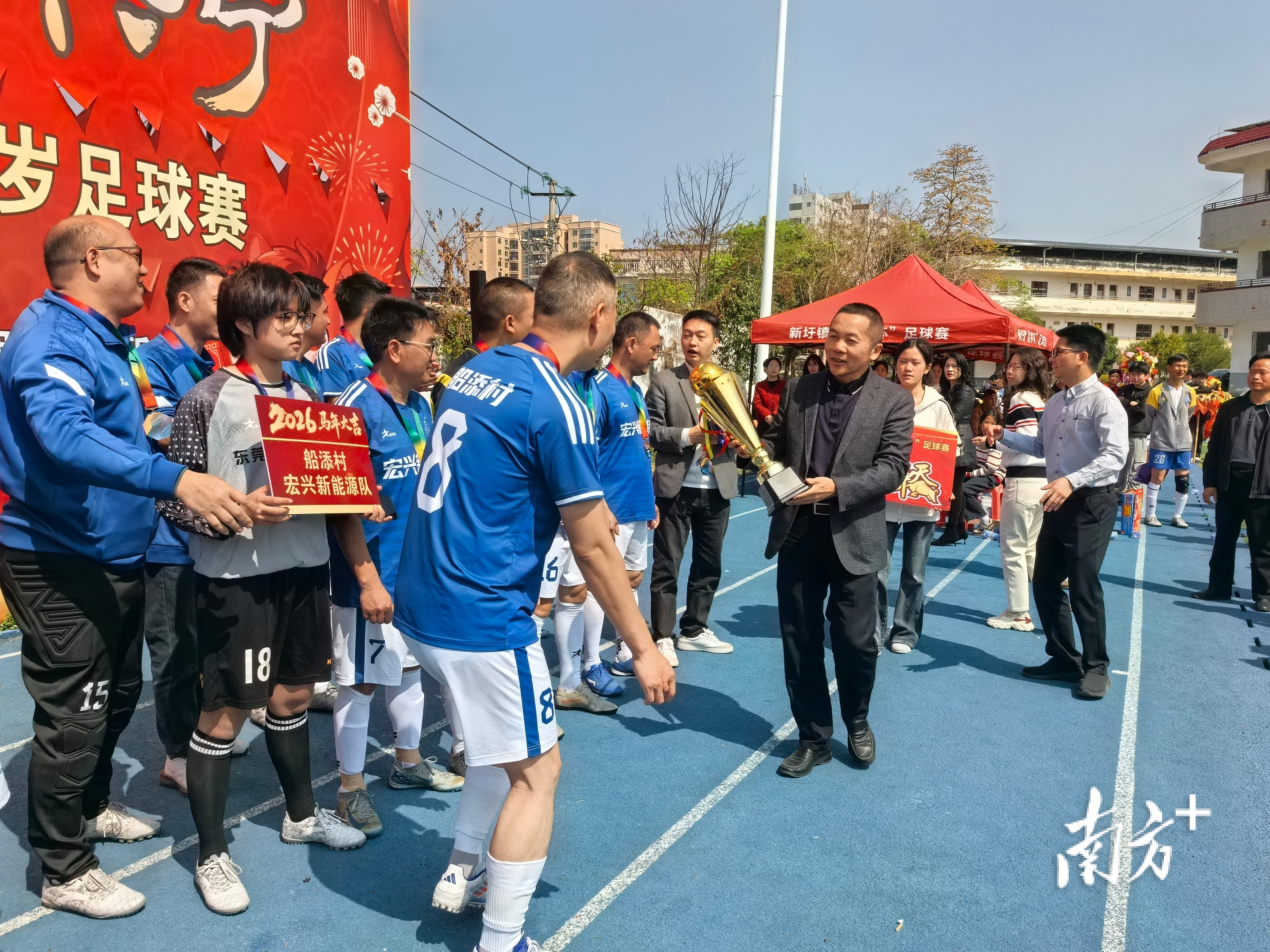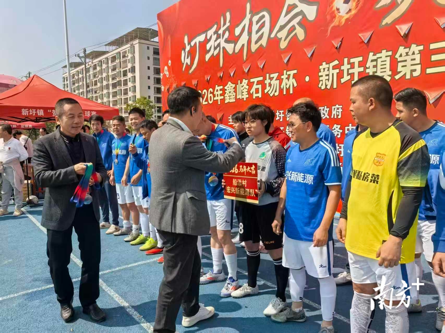 座谈会后,参会人员移步新圩中学足球场,参加新圩镇第三届贺岁足球赛决赛颁奖典礼,受邀乡贤与嘉宾为获奖队伍颁奖,现场掌声不断。