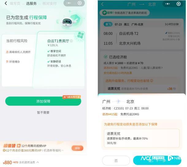 以7月23日广州飞北京的南航航班CZ3101为例,南航官网经济舱裸票价实时显示为1750元,航旅纵横显示价格与之一致。尽管预订页面滑到下方显示有航空意外险、航意险等出行保障产品推荐专区,但并没有默认勾选。