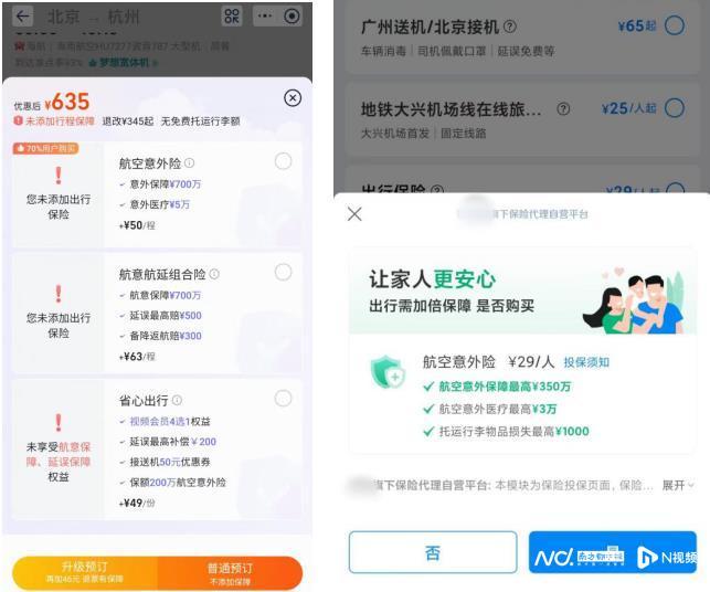 南都记者搜索对比发现,目前在携程、去哪儿、同程、飞猪等OTA平台销售的机票,出票渠道多分为平台自营、航司旗舰店、第三方代理机构几种。若用户选择附加服务保障包的机票产品,系统默认会将保障包费用加进总费用中;除此外的机票产品,用户下单时、支付款项前,平台都会弹出1~2次附带各类服务(如“退票无忧”保障、改期延误保障、航意险、接送机、机场休息室等)的选项,用户必须做选择后方可进入付款页面。有的平台还会将添加服务选项有关字眼用深色突出显示,用户不仔细看容易点错,买完了才后知后觉。
