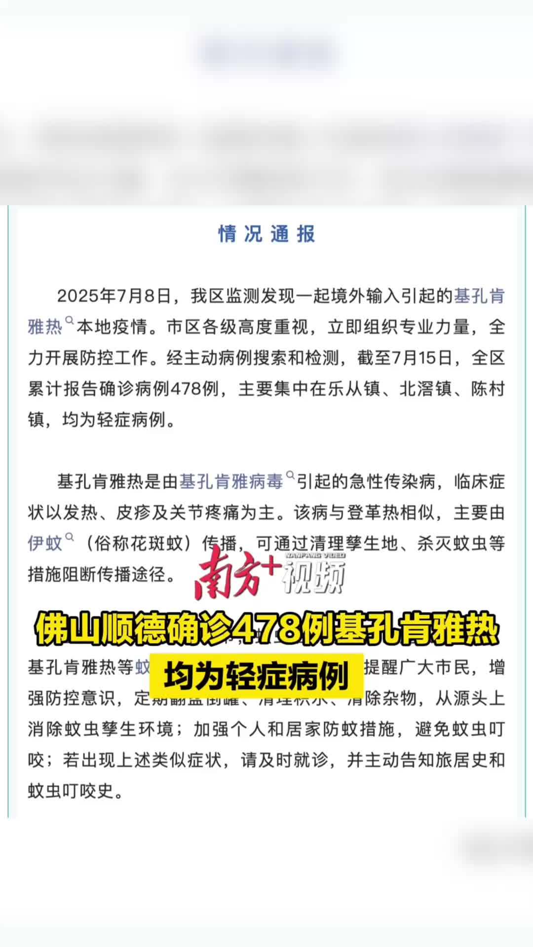 7月15日,佛山市顺德区通报一起境外输入引起的基孔肯雅热本地疫情,截至通报发布,顺德全区累计报告确诊病例478例,主要集中在乐从镇、北滘镇、陈村镇,均为轻症病例。